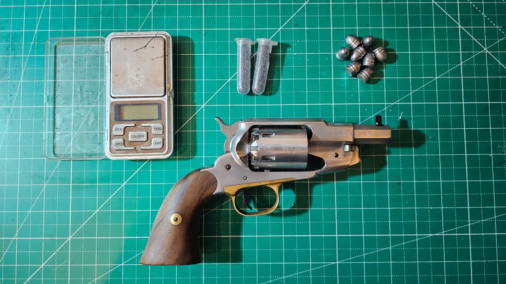 Proch został odmierzony wagowo na wadze kieszonkowej o zakresie 200 g i dokładności 0,01 g. Odmierzona naważka to 33,5±0,2 gr. Przy ładowaniu rewolweru okazało się jednak, że o ile w przypadku prochu 3f da się wcisnąć pocisk tak, żeby nie wystawał z bębna, to przy prochu 4f nie jest to możliwe. Zostały więc na miejscu (na strzelnicy) odmierzone objętościowo naważki 36 gr. Odchylenie standardowe tak odmierzonych naważek nie zostało sprawdzone. Użyłem pocisków stożkowych .450” o wadze 209,9±0,9 gr. Użyłem kapiszonów Sellier&Bellot 4,0.