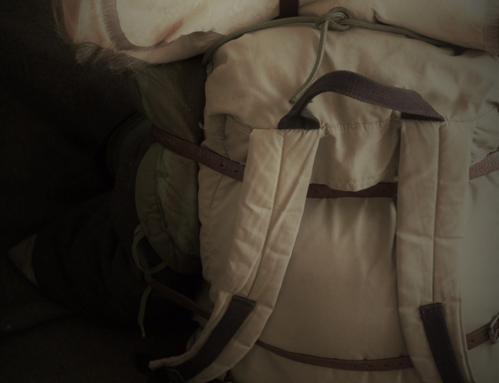 Miałem plecak uszyty według dawnych krojów, ale z nowoczesnym systemem nośnym. Wymontowałem system nośny i z tradycji łączonej z nowoczesnością została sama tradycja. Płócienny, trzydziestolitrowy worek z szelkami, bez żadnego usztywnienia. Usztywniłbym go karimatą, ale uznałem to za zbytek. Zamiast karimaty zabrałem futro renifera. Zamiast śpiwora trzy koce: wełniany, polarowy i to amerykańskie cudo w maskowaniu woodland. Zamiast kurtki przeciwdeszczowej i namiotu trzy poncha. Jedno cienkie na grzbiet i dwa amerykańskie wojskowe, wciąż cuchnące starym magazynem, zamiast namiotu. Nie miałem większego pojęcia jak wiązać węzły, ani jak rozwieszać poncha. Kleiłem je srebrną taśmą i rozwieszałem wiążąc linki na supły.